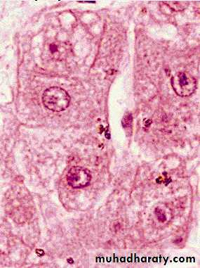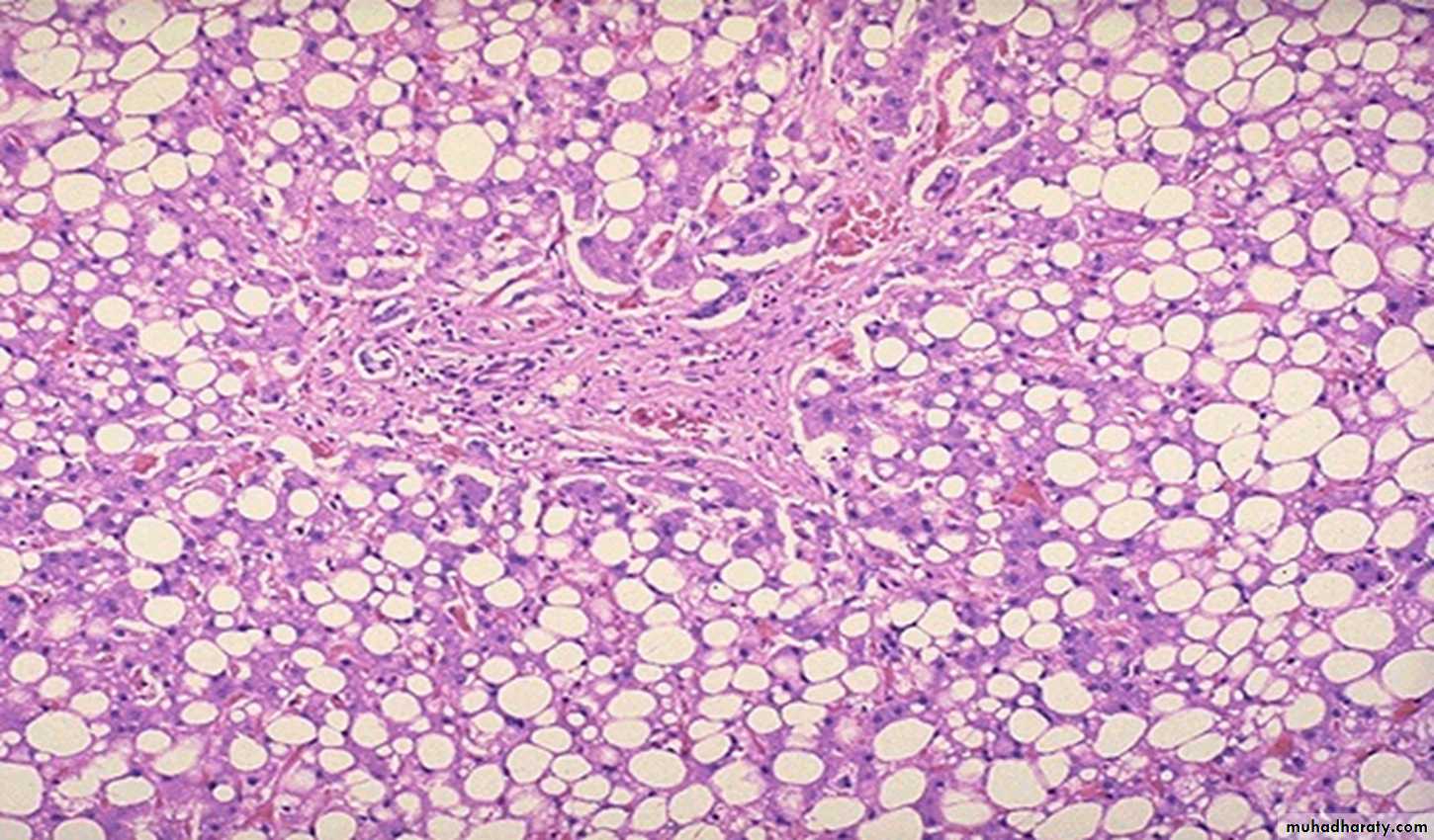 Fatty changes of the liver a large clear space of a fat inside the hepatocyte that displaces the nucleus to the periphery
