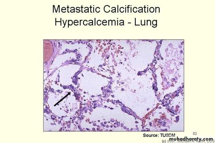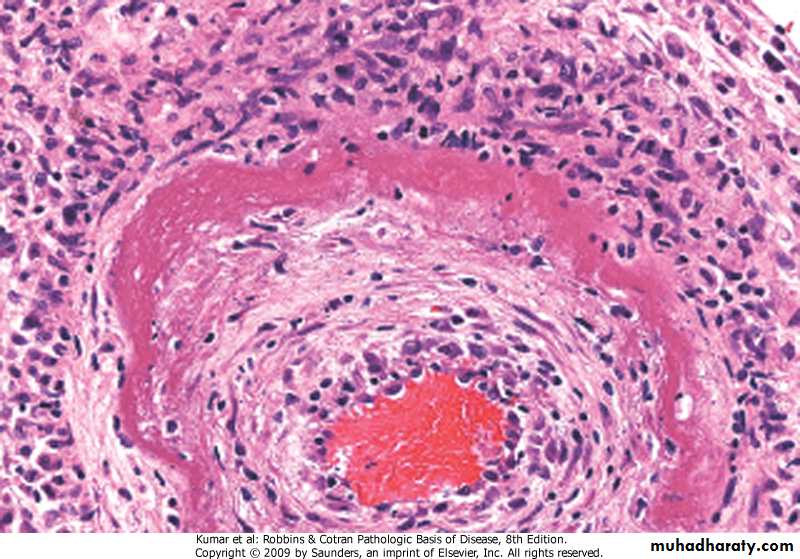 shadowy outlines of necrotic fat cells, with basophilic calcium deposits, surrounded by an inflammatory reactionFibrinoid necrosis. It is marked by deposition of fibrin-like proteinaceous material in arterial walls, which appears eosinophilic on light microscopy.