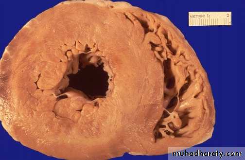 Myocardial infraction, the cells become more eosinophilic , loss of striation, absence of nucleus & their outline are preserved