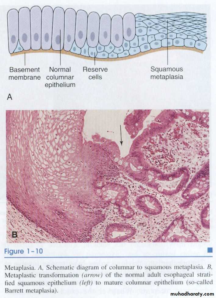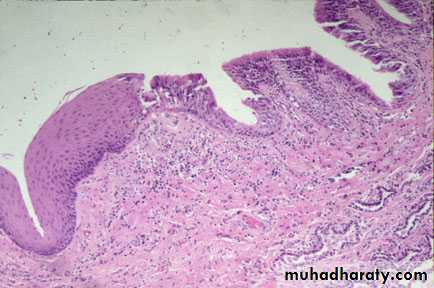 Metaplastic transformation (arrow) of the normal esophageal stratified squamous epithelium (Lt) to mature columnar epitheliumSquamous metaplasia of bronchial epithelium