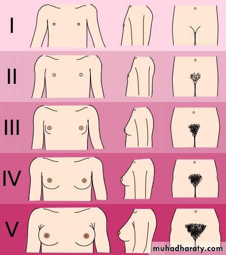 The first physical signs of puberty are breast budding and this is usually as an indicators of development and is often unequal between the 2 breast, thelarche occurs 2 or 3 years before menarche. The appearance of pubic hair is dependent on secretion of adrenal androgens and is usually after thelarche. The mean age of menarche is 12.8 years and it may take over 3 years before the m.c establishes a regular pattern. Initial cycles are usually anovulatory and can be unpredictable and irregular. Pubertal development was described by Tanner and the stages of breast and pubic hair development are having 5 stages, but the axillary hair only have 3 stages.