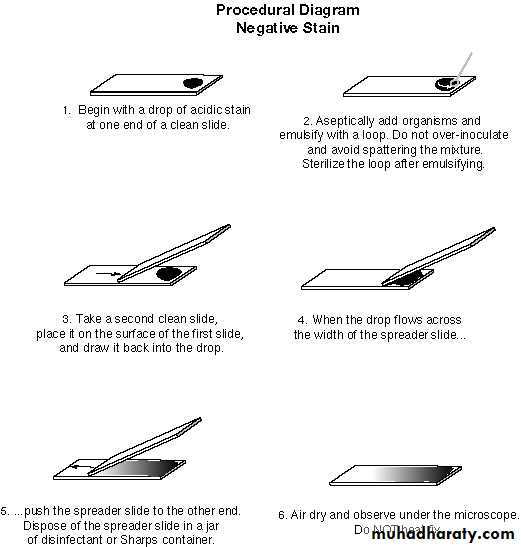 By means of bacteriological loop, put a drop of nigrosin stain or india ink stain on a clean slide, then transfer a small amount of culture on the drop, mix and spread it .Leave the preparation to dry and examine under oil immersion power