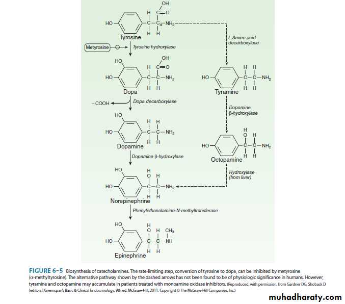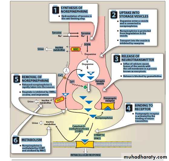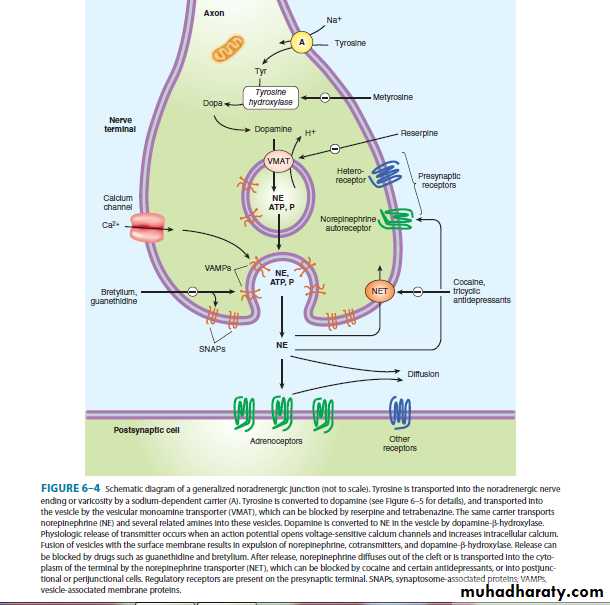 Adrenergic neurons transport the precursor amino acid tyrosine into the nerve ending, convert it to dopa, and then synthesize a catecholamine transmitter dopamine, norepinephrine, or epinephrine, and store it in membrane-bound vesicles.