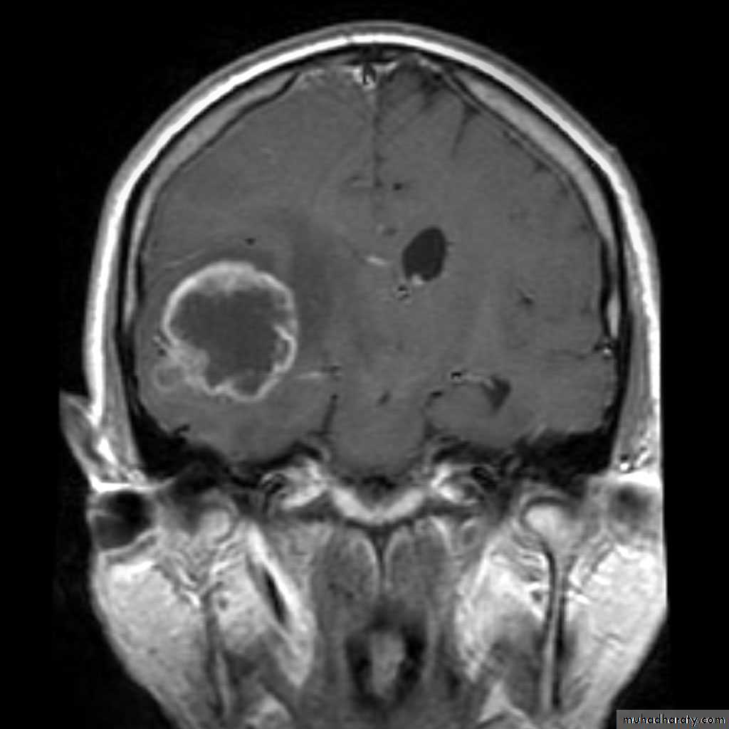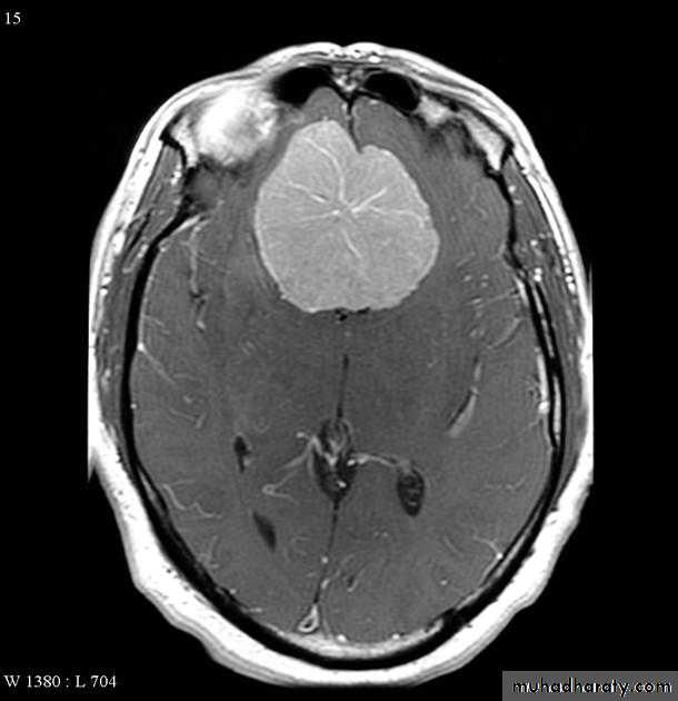 • AT MRI, same as for CT. The essential features are a mass, often with adjacent oedema.