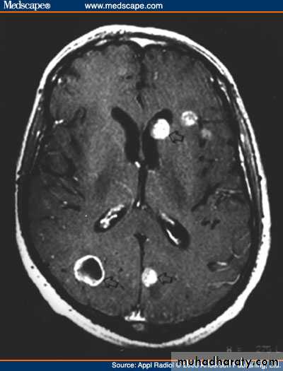 • Encephalitis is caused by infection, usually viral or by an immune reaction to infection. CT and MRI show unilateral or bilateral focal abnormal areas, often in a characteristic distribution appearing as low attenuation on CT and high signal on a T2-weighted MRI scan• An abscess can be caused by pyogenic, tuberculous, fungal or parasitic organisms. Necrosis and pus formation occur in the center of the abscess, which appears as low density on CT. The wall of the abscess enhances with intravenous contrast and may be surrounded by oedema giving an appearance known as ring enhancement
