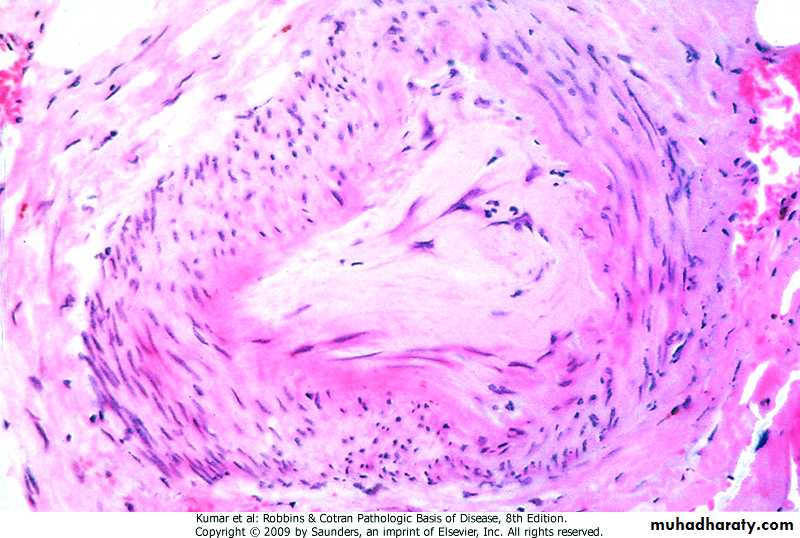 later, endothelial cell proliferation and thickening of the intima resulting in narrowing or obliteration of the vascular lumens leading to scarring & ischemia.