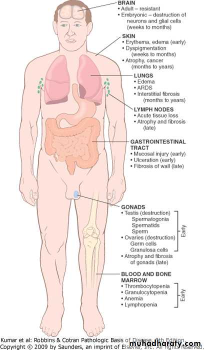 ■ Ionizing radiation damages DNA; therefore, rapidly dividing cells such as germ cells(gonads), the hematopoietic and lymphoid systems , and the lining of the gastrointestinal tract are very sensitive to radiation injury.