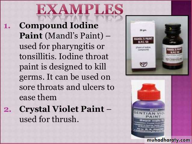 -Throat paints are more viscous due to a high content of glycerol, designed to prolong contact of the medicament with the affected site.