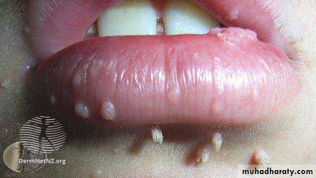 occasionally occur in the mouth or, more commonly, on and around the lips. In children these are often the result of autoinoculation by chewing warts on the hands.