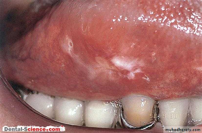 Leukoedema is the name given to a filmy grey coating of the buccal mucosa that is found in a high proportion of patientsHistologically, this lesion has been described as being parakeratotic, with large swollen cells in the superficial layers of the epithelium