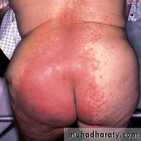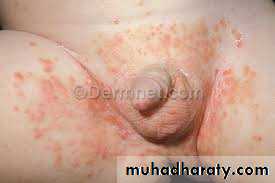 Tiny pustules and papules are observed closely adjacent to the patches, termed “satellite or daughter” lesionsRx: Topical anticandidal preparations are usually effective. Oral anti-candidal agents are alternative