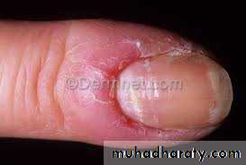 Redness, edema, and tenderness of the proximal and lateral nail foldsUsually the fingernails are affected more than toenails