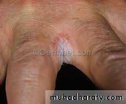 Oval shaped area of macerated white skin associated with fissures and raw red skin at the center on the web between fingersNearly always between the middle and ring fingers