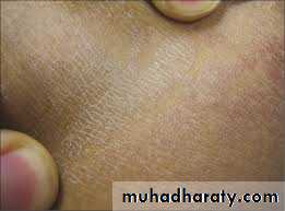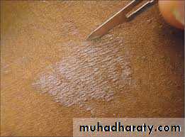 Present with multiple hyperpigmentd or hypopigmented patches with fine(fluffy or furfuraceous) scale. Demonstration of this associated scale may require scratching or stretching the skin surface