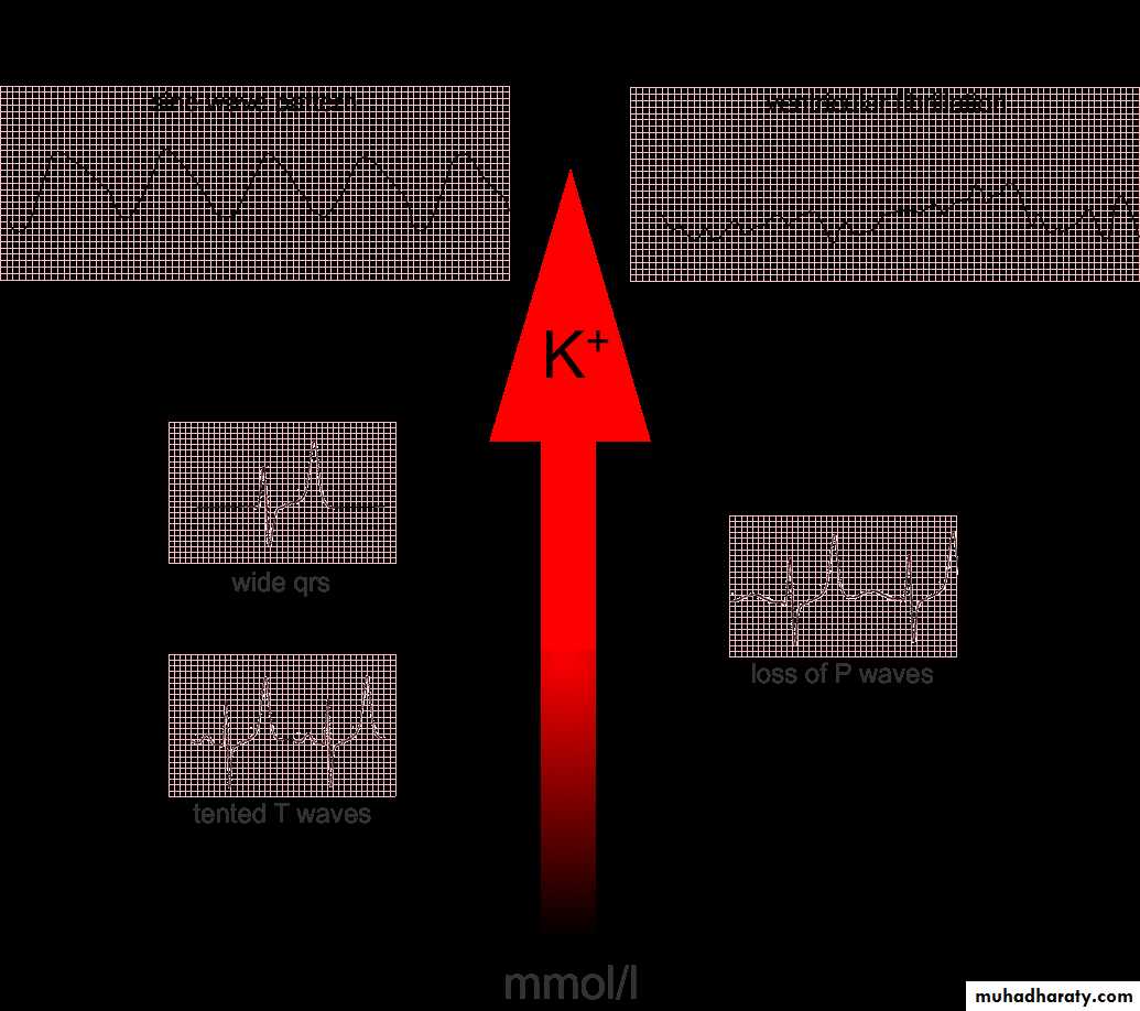 • Rapid development of hyperkalemia (S. K >6 mEq/L) can lead to cardiac arrhythmia, cardiac arrest, and death.• The earliest ECG change is peaked T waves, followed by widening of the QRS, ST segment depression, ventricular arrhythmias, and cardiac arrest.