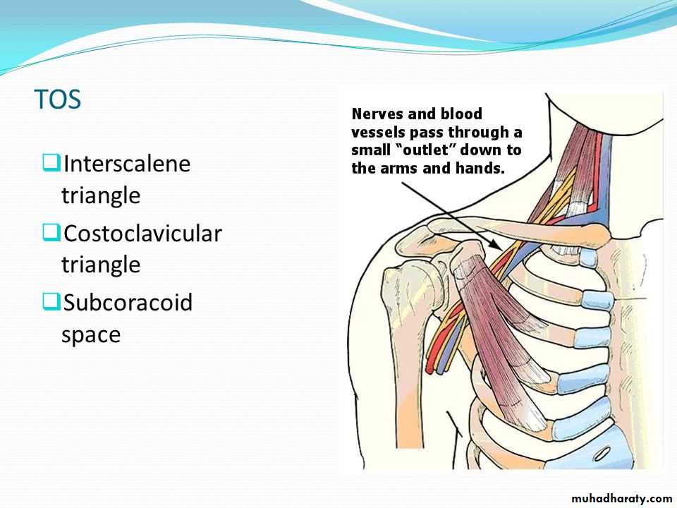 syndromes that result from compression of the neurovascular structures passing from the chest and neck to the upper extremities.The syndrome is caused by compression of the brachial plexus or subclavian-axillary artery and/or vein in the region between the thoracic outlet and the insertion of the pectoralis minor.These syndromes include: