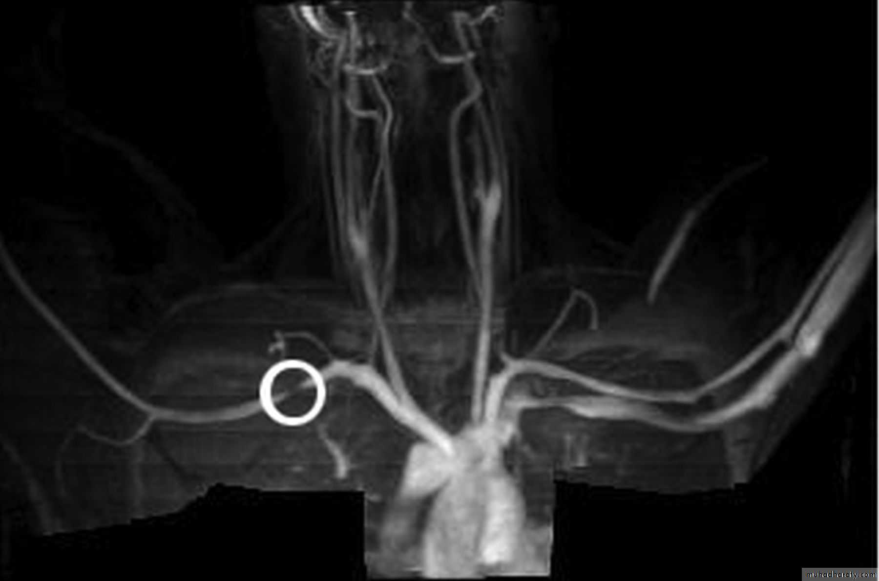 Clinical maneuversAdson or scalene maneuver: While the physician monitors the radial pulse, the patient takes a deep breath, extends the neck, and turns the chin toward the side being examined. Disappearance or reduction of the radial pulse constitutes a positive finding. During a positive test, a bruit frequently becomes audible in the supraclavicular fossa and the hand may become cool and pale. The deep breath causes elevation of the first rib and extending and turning the neck causes narrowing of the interscalene triangle. If the pulse is altered before the head is turned, one should suspect the presence of a cervical rib.