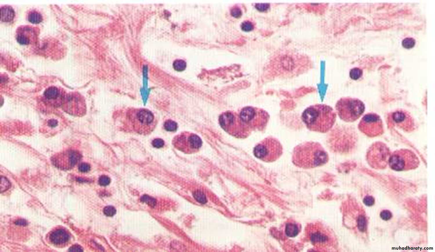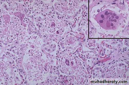 Diagnosis: Viral myocarditisviral infection in the alveolar wall. Showing giant cell originate from epithelial cells with inclusion body of virus within the giant cells
