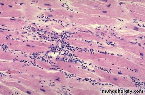Cardiac muscle fibers show a lymphocytic infiltrate