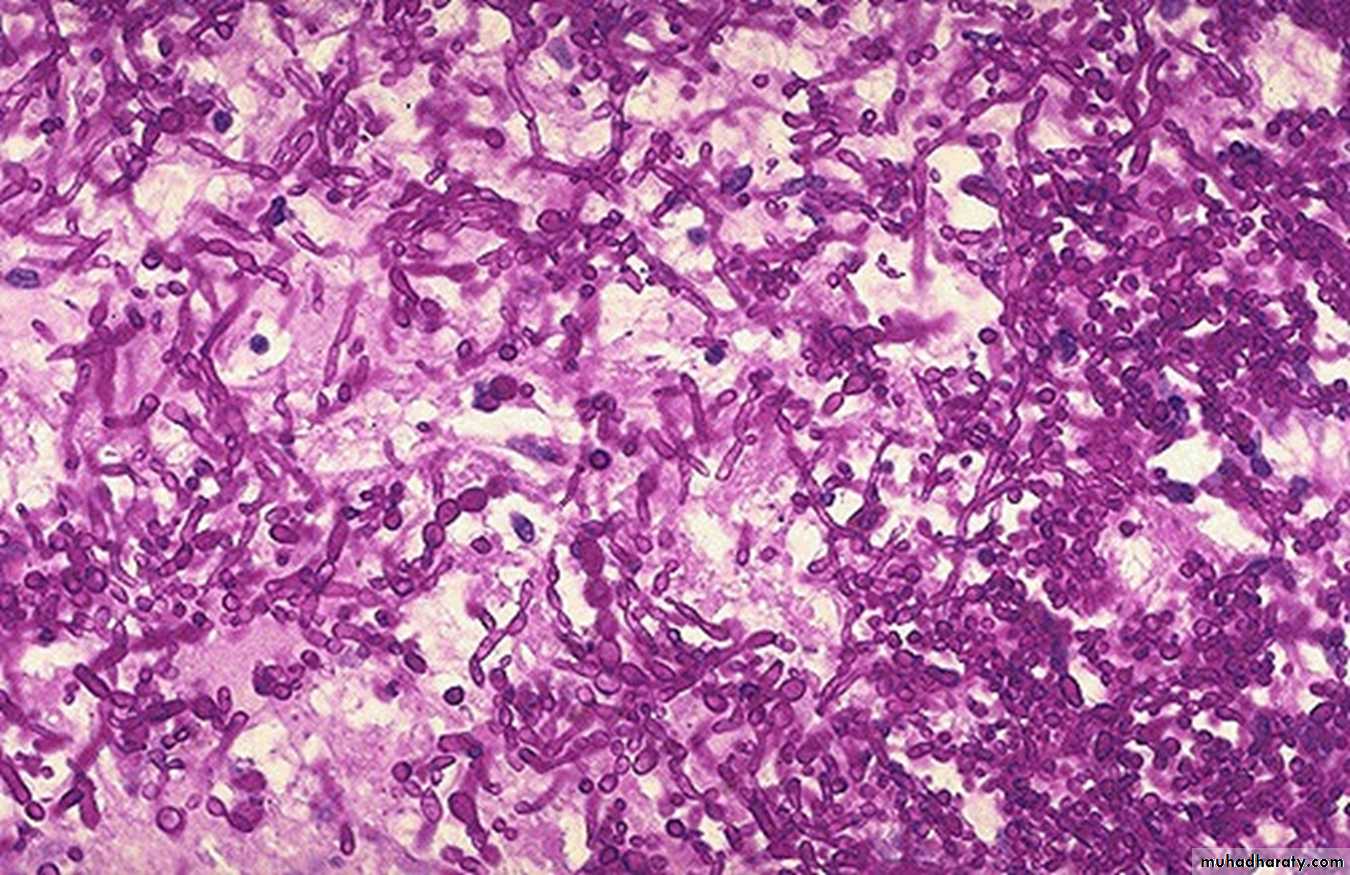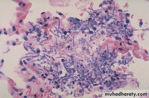 Diagnosis Aspergillus infection, :Yeast A numerous budding cells and pseudohyphae characteristic for Candida.