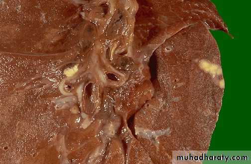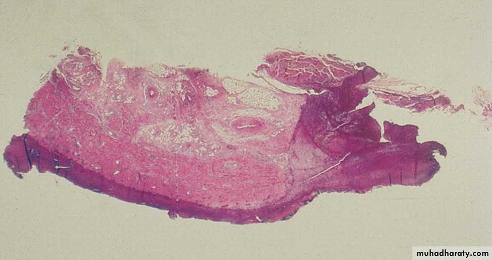 Pharyngeal pseudomembrane. Epithelium is absent; at one side, inflammatory exudate extends to underlying muscle Diagnosis : DiphtheriaPeripheral sub pleural small whitish yellow lesion (Ghon focus) & hilar lymph node enlargement in primary T.B (cheesy like material) Diagnosis: Ghon’s complex of primary TB..