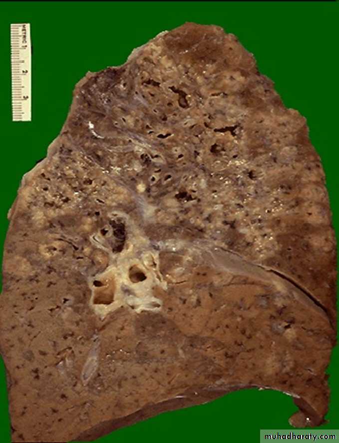 Multiple irregular cavitations & extensive area of necrosis involving the upper lobe of the lung Diagnosis: secondary T.B
