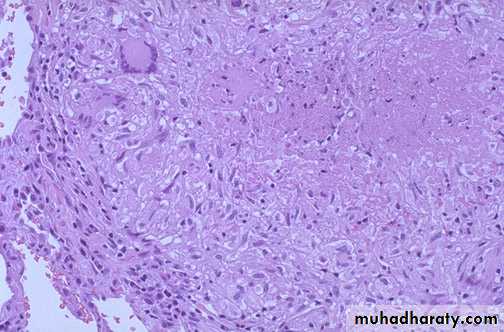 Granuloma with central caseous necrosis surrounded by epithelioid cells & Langhans giant cell (multinucleated giant cells) surrounded by a rim of lymphocytesDiagnosis: T.B lung (caseating granuloma)