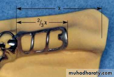 The minor connector for the mandibular distal extension base should extend posteriorly about two-thirds the length of the edentulous ridge and should have elements on both lingual and buccal surfaces.