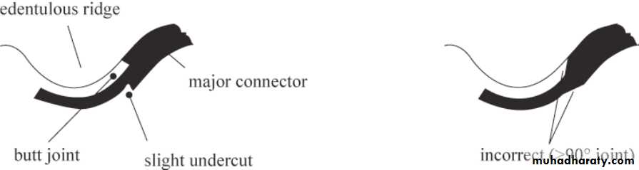 The junction of gridworks to the major connector should be in the form of a butt joint with a slight undercut in the metal. The angle formed by the metal at this juncture must not be greater than 90 degrees.If these butt joints occur on the outer aspect of the major connector they are called external finish lines; if they are on the internal or tissue side of the major connector ,they are internal finish lines .