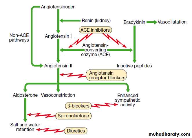 The angiotensin II receptor antagonists (ARA) (candesartan and valsartan) are indicated as second-line therapy in patients intolerant of ACEI. Unlike ACEI they do not affect bradykinin metabolism and do not produce a cough.