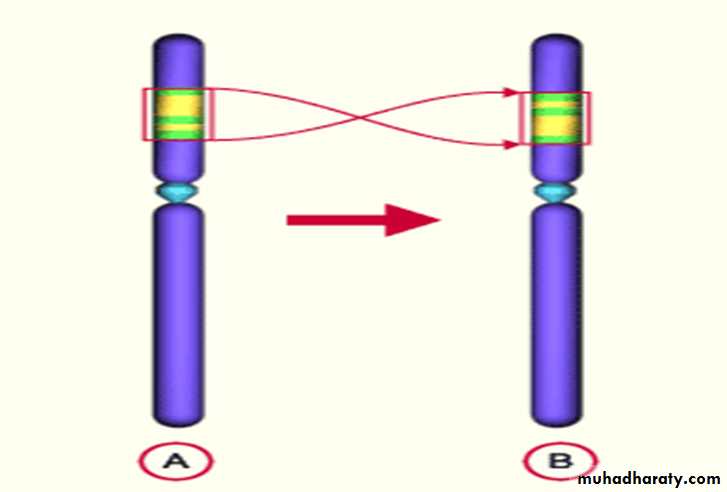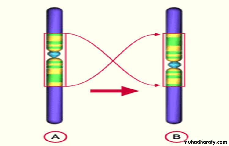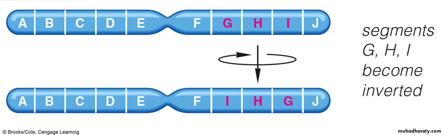 • occurs when there are two interstitial breaks in the chromosome, and the segment reunite after a complete turnaround (the piece between the two breaks will rotate 180o and is fixed back again in its rotated position).