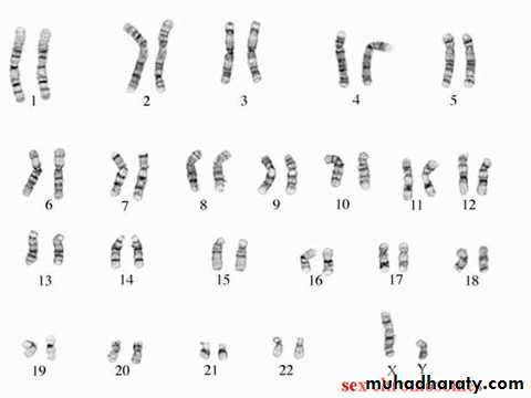 Normal human nucleated cells contain 46 chromosomes arranged in 22 homologous pairs of autosomal chromosomes in addition to one pair of sex chromosomes that could be similar (i.e. XX) or different (i.e. XY). This arrangement into pairs, based on the position of the centromere and on the length of the upper and lower arms of the chromosomes, is known as the Karyotype
