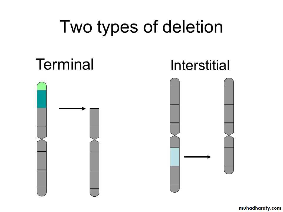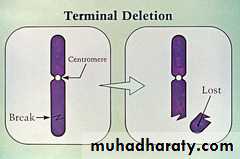 i. Terminal, in which, there is one break in the chromosome and the portion distal to this break is lost. This lost piece could be carrying important genes, and its loss results in signs and symptoms related to the lost genes products