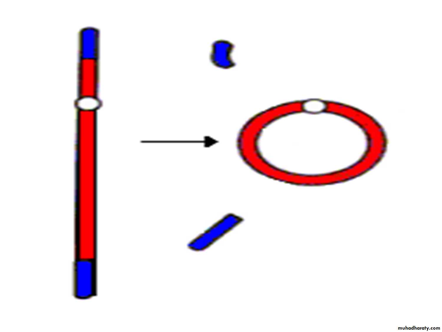 ii. Interstitial, where the piece of a chromosome between two breaks is lost resulting in a chromosome that is shorter than the original with the same consequences.• Ring chromosome is a variant of a deletion, after loss of segments from each end of the chromosome, the arms unite to form a ring, because of the adhesive nature of the exposed DNA, will stick together forming a ring or a circle chromosome.