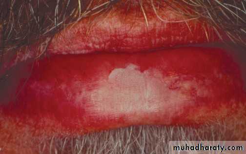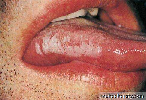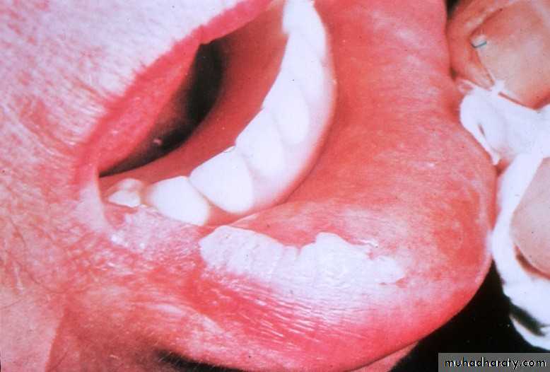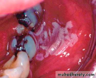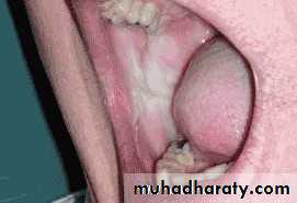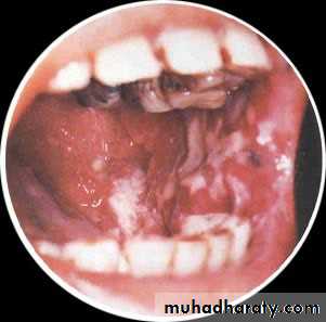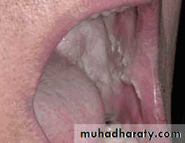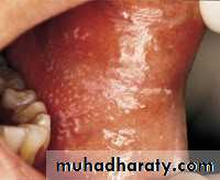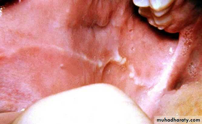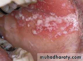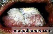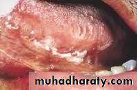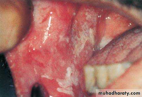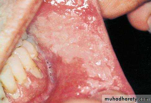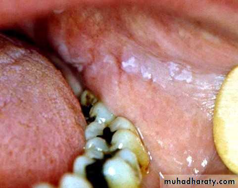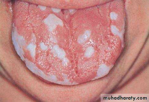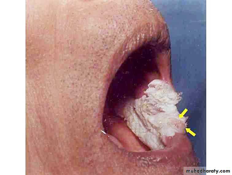 • Firm white leathery plaques• Cheek ,lip ,tongue
