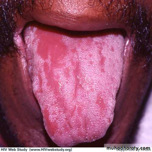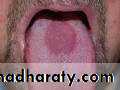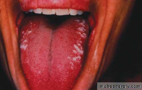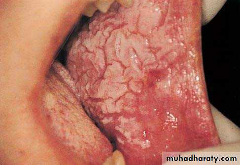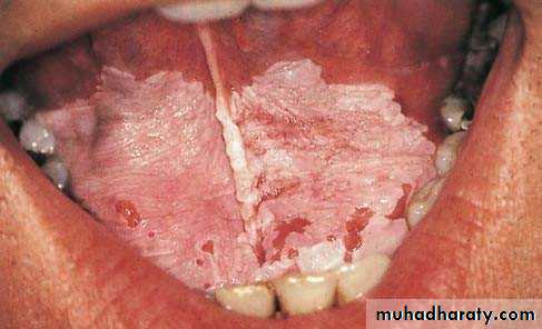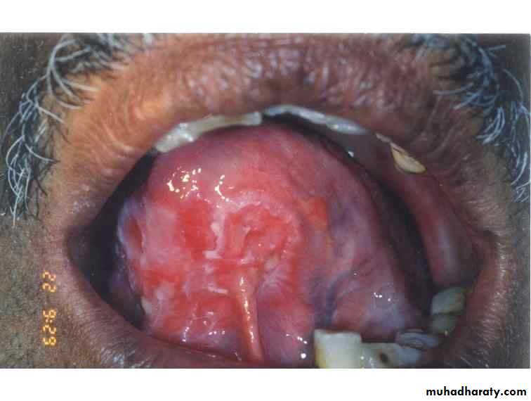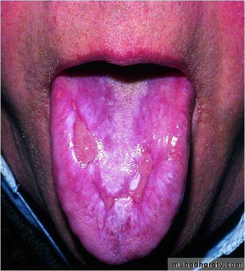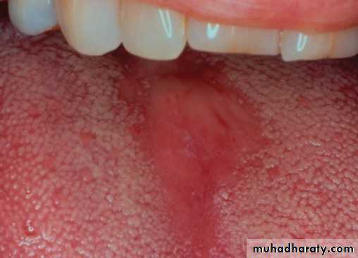 • Red patch of atrophic papillae• Central area of dorsum of tongue
