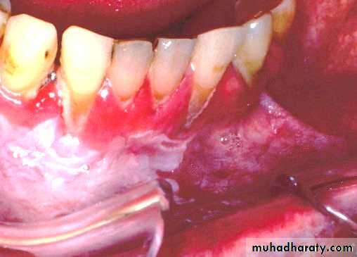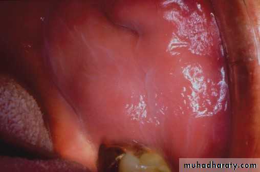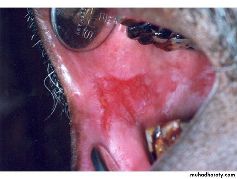 • Inflammed areas of oral mucosa• Covered by thinned red epithelium