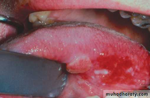 • Mainly on lateral border or ventral surface of the tongue