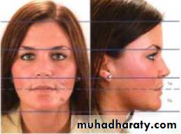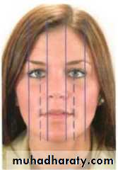 An ideally proportional face can be divided into central , medial ,and lateral equal fifths. The separation of the eyes and the width of the eyes, which should be equal ,determine the central and medial fifths. The nose and chin should be cantered within the central fifth, with the width of the nose the same as or slightly wider than the central fifth. The inter – pupillary distance (dotted lines) should equal the width of the mouth.Vertical facial proportions in the frontal and lateral views are best evaluated in the context of the facial thirds, which the Renaissance artists noted were equal in height in well-proportioned faces. In modern Caucasians, the lower facial third often is slightly longer than the central third. The lower third has thirds : the mouth should be one-third of the way between the base of the nose and the chin.
