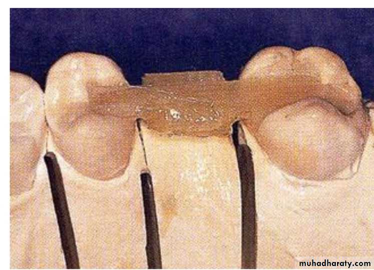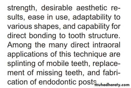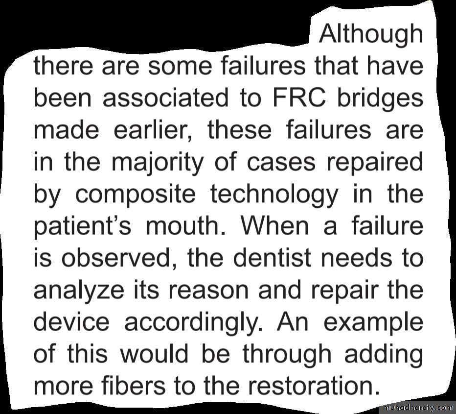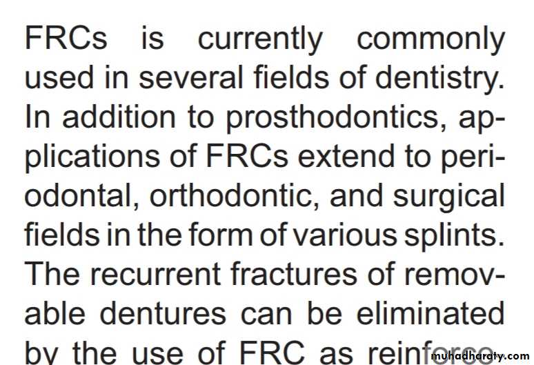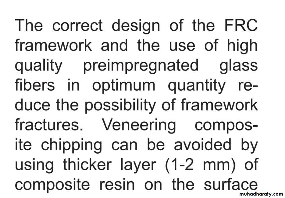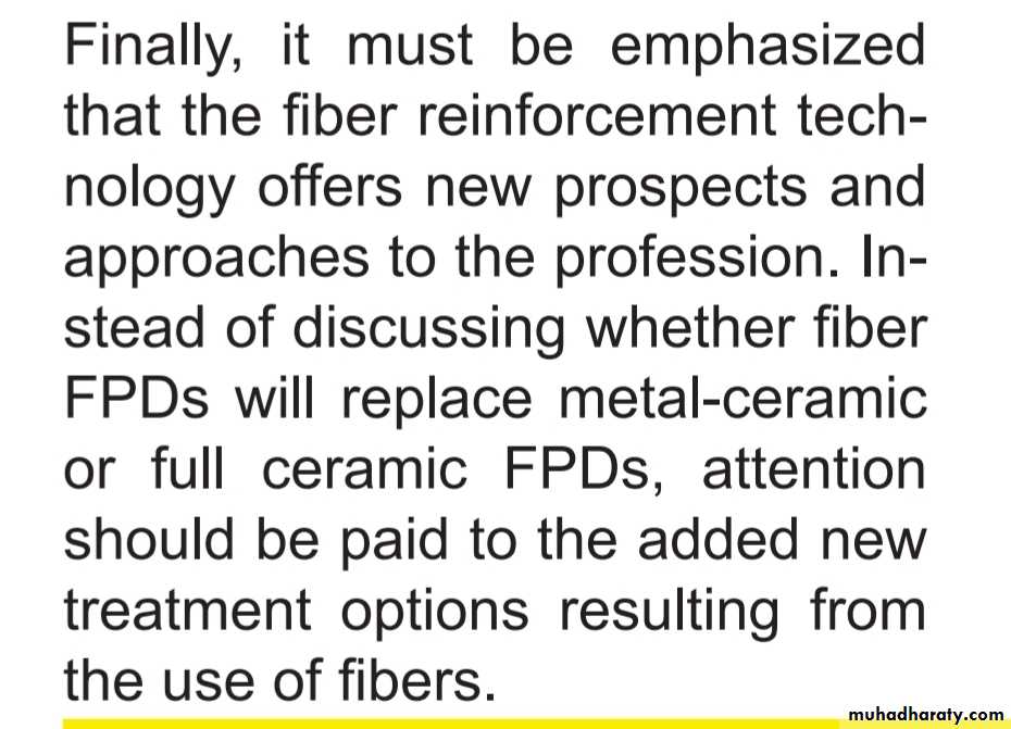 • disadvantages. These disadvantages culminate in the bonding and aesthetic problems of metalframeworks. Fortunately, these problems can now be overcome,• to a large extent, by the use of fiber reinforced composite (FRC). In fact, the bond strength between the prostheses and the abutment teeth obtained when using FRCmaterials is 50-100 % higher than the bond strength achieved when using metal framworke