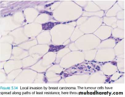 -Malignant cells have the ability to invade the surrounding tissues .-Tumor cells follow the paths of least resistance and spread easily through loose fibrous and adipose tissue.