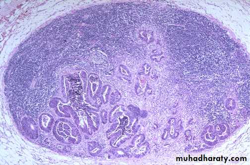 Microscopically, metastatic adenocarcinoma in a lymph node It is common for carcinomas to metastasize to lymph nodes