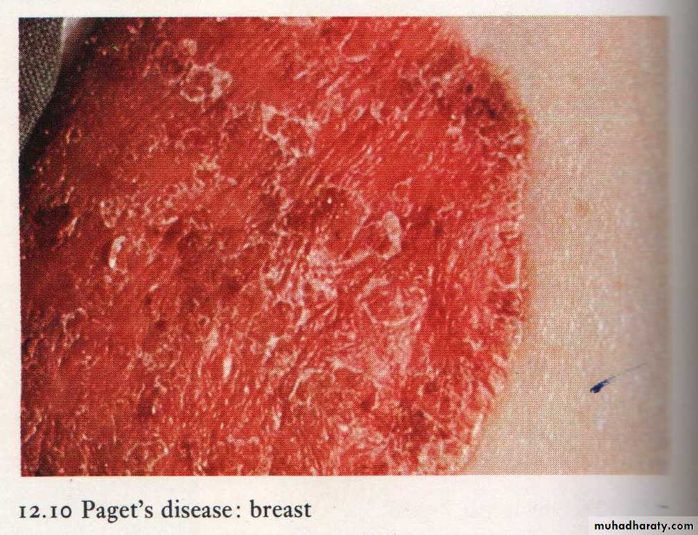 It is best seen in Paget’s disease of the nipple in which the cells of ductal carcinoma (in situ or invasive carcinoma) of breast grow through the duct into the nipple skin giving an appearance resembling eczema