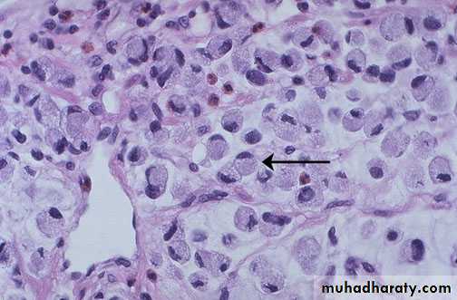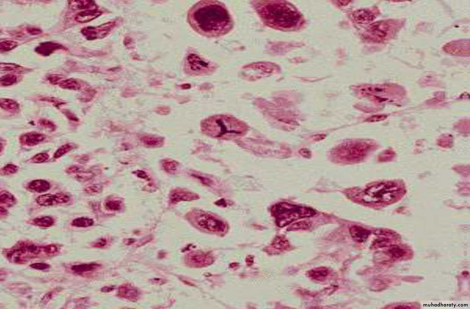 and shape. The prominent cell in the center field has an abnormal tripolar spindle.Signet ring carcinoma of stomach( Poorly differentiated Adeno-carcinoma) The tumor cells have eccentric nuclei, pushed to the side by a central globule of mucus.