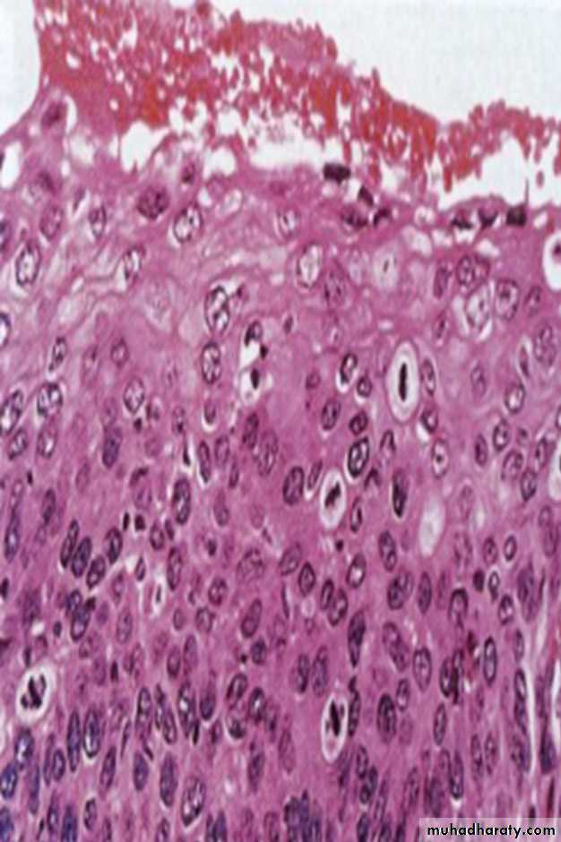 Disordered growth in epithelial membranes (e.g. the squamous epithelium of the cervix, skin, and bronchial mucosa) characterized by1. Pleomorphism
