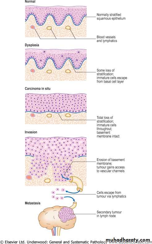 Evolution of an invasive squamous cell carcinoma from the precursor lesions of dysplasia and carcinoma in situ (usually grouped together as intraepithelial neoplasia). Note that the tumor cells cannot reach routes of metastasis such as blood vessels and lymphatics until the basement membrane has been breached