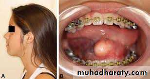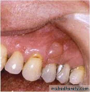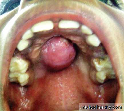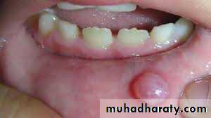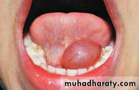 4. Mucoceles:Result from obstruction of a glandular duct or ( minor salivary gland duct) and are commonly located in the lip, cheek and floor of the mouth. They may also be found on the anterior portion of the tongue. Where glands are located at the inferior surface. These are small, round or oval, translucent swellings, some times having a bluish color. The mucocels is freely movable and usually found right underneath the mucosa. The preferred treatment is complete excision. If the mucocele is incompletely removed, it has a marked tendency to recur but the lesion is not known to become malignant.