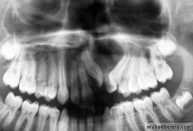 3. Globulomaxillary cysts:G. cyst are epithelial lined sacs formed at the junction of the globular and maxillary processes between the lateral incisor and canine teeth They usually cause a divergence of the roots of these teeth and appears as a pear-shaped radiolucency's on x-ray film. As is true with other cysts of the oral-cavity, they become secondarily infected and undergo acute inflammatory changes. Treatment is surgical and consists of careful excision.