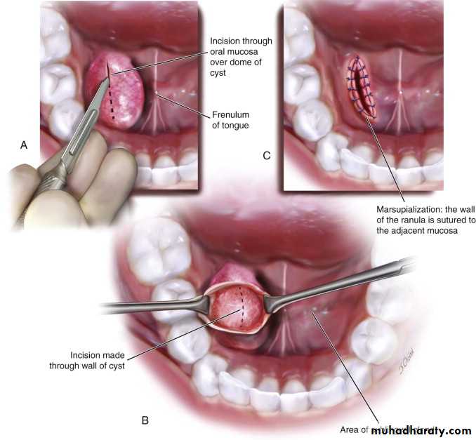 operation by which the cyst is un covered or de roofed and cystic lining made continuous with the oral cavity or surrounding structures. Like surrounding periosteum, and held in place with dressings, if gauze dressings are used. They may be removed in about 7 to 10 days.