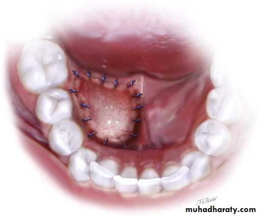 2.Dermoid cysts:D. cyst are relatively uncommon in oral cavity. The cyst consists of a fibrous wall lined with stratified squamous epithelium which contains hair, sebaceous and sweat glands. As well as tooth structures. They may occur on the hard and soft palate, on the dorsum of the tongue or more commonly in the floor of the mouth above or below the geniohyoid muscle usually in the midline.Treatment is the surgical removal.